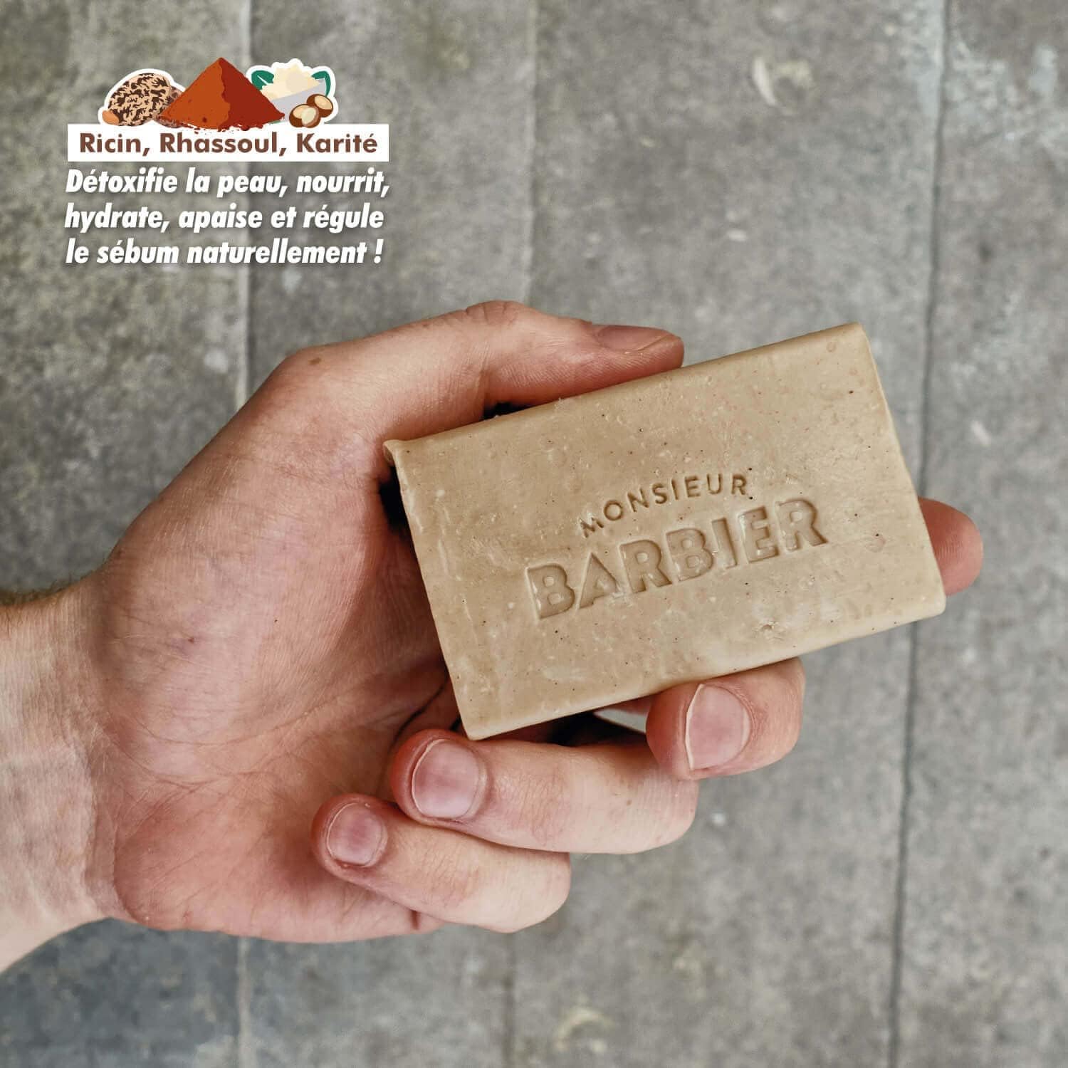 - Lipid-enriched face & body soap - RHASSOUL KITCHEN - 100gr 8% lipid-enriched soap for maximum hydration With 97.1% of ingredients of natural origin The equivalent of a 200mL cleansing gel Can also be used as a solid shampoo or as a clay mask. As always, Monsieur Barbier offers a clever blend of natural ingredients: rhassoul cleans, purifies, and nourishes your skin and beard, while shea butter brings richness and creaminess for maximum comfort in the shower. 97.1% of ingredients are of natural o
