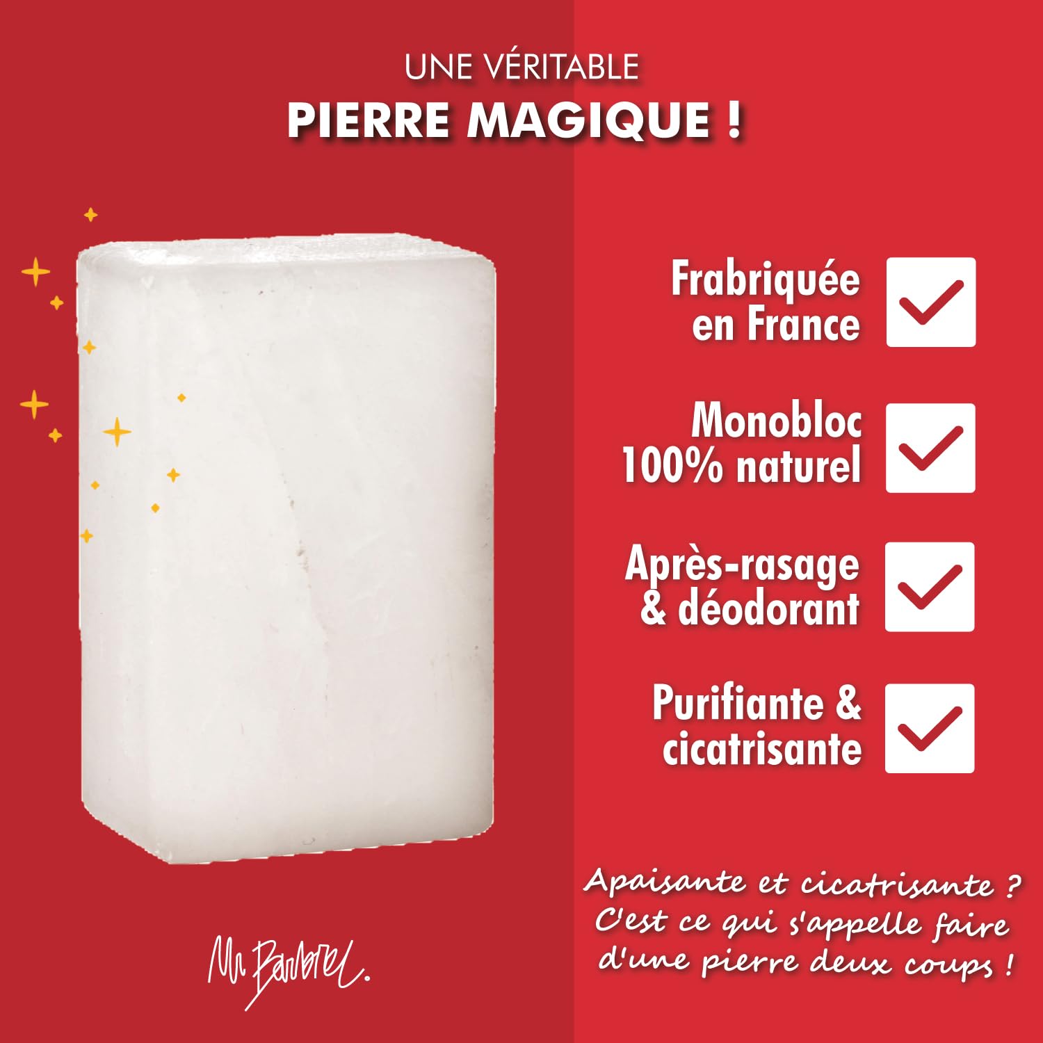 Monsieur BARBIER's natural alum stone is cut directly from the block, with no reconstitution! For maximum longevity and ultimate comfort. An alum stone is a block of natural mineral salt extracted from quarries all over the world. Used for centuries for its purifying, astringent, soothing and healing properties, it has become an essential accessory for Master Barbers. Before shaving, it smoothes the skin and straightens the hair. After shaving, it repairs the skin while preventing irritation and infection.