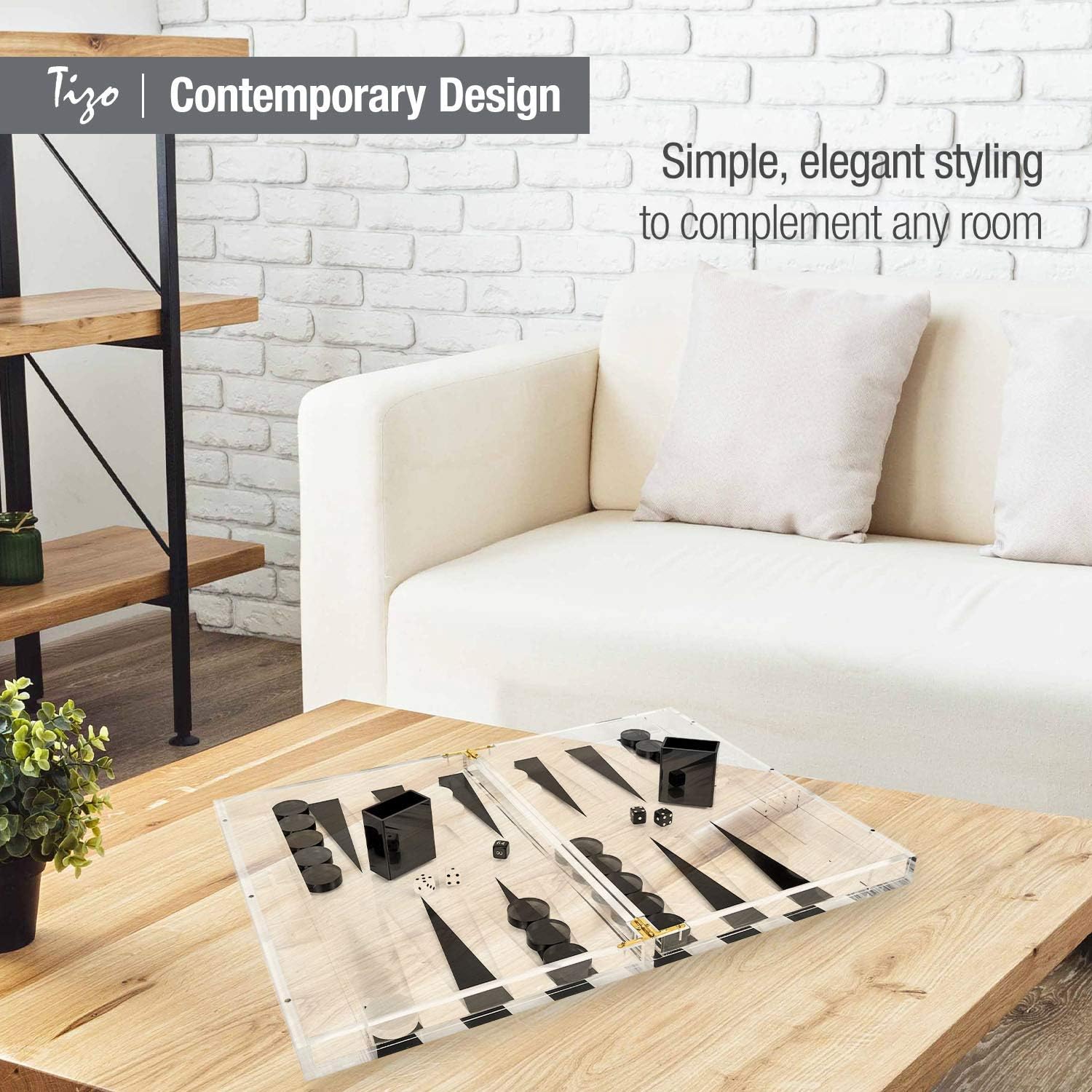 • Elegant Backgammon Set – This deluxe Lucite backgammon board game makes a beautiful addition to your game room or den, and it looks great open or closed; The backgammon set features a high-quality lucite case with lucite chips and cups