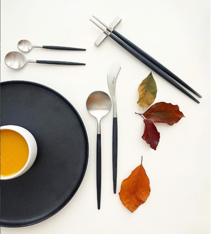 Handmade in Portugal, the Cutipol Goa GO29 chopstick set is a masterclass in modern dining. Conceived by the visionary José Joaquim Ribeiro, this set represents a perfect symbiosis between Eastern tradition and Western ergonomic precision. It features high-performance 18/10 matte brushed stainless steel tips that transition seamlessly into slender, tapered resin handles finished in a deep, non-reflective black.