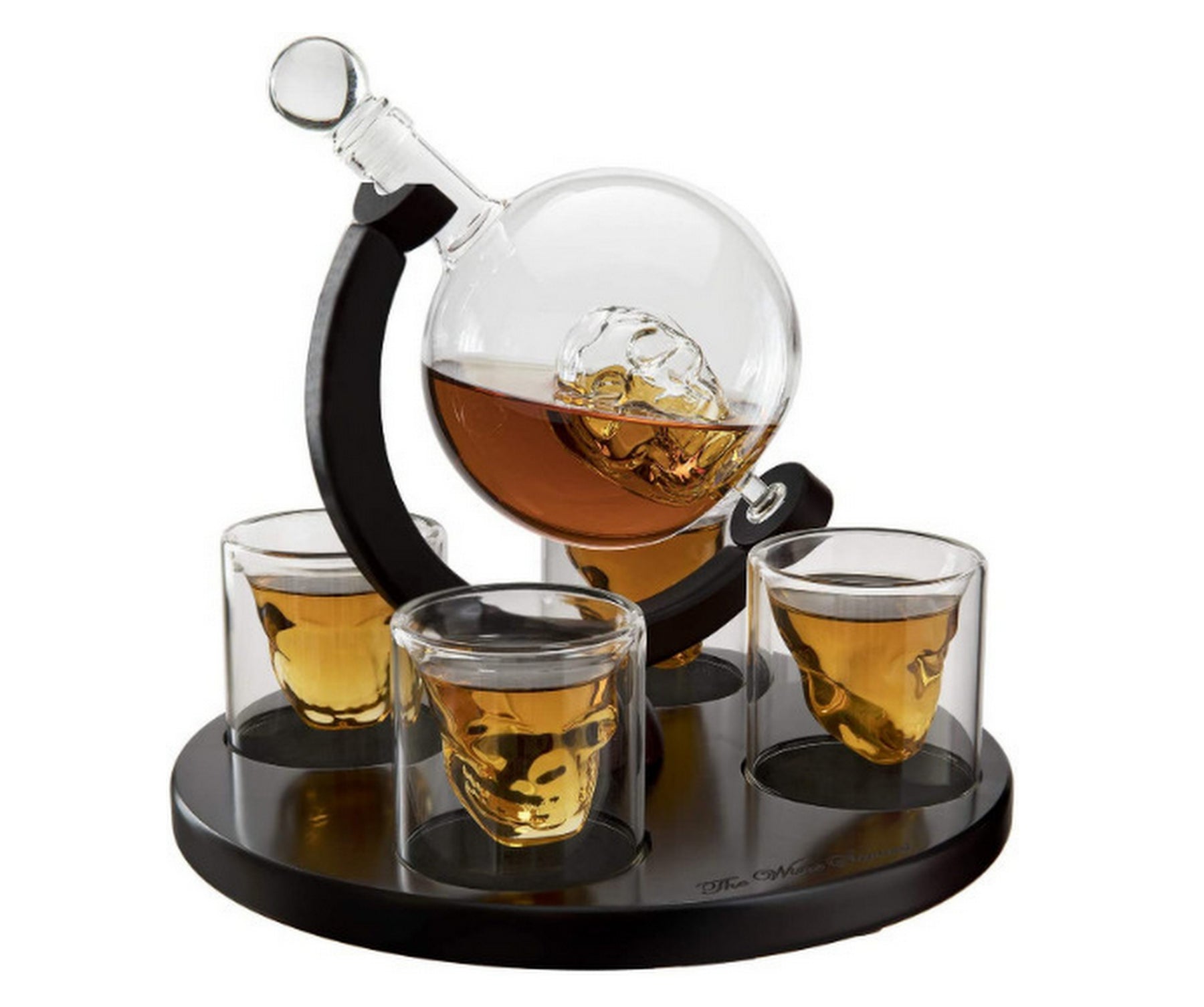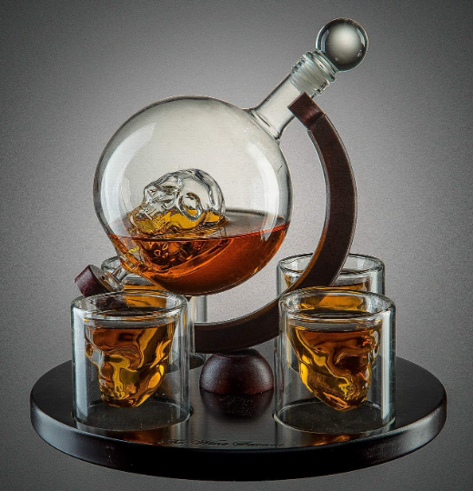 HIGHEST QUALITY: Complete with 1 skull-shaped decanter, 4-skull shaped shot glasses and a wooden tray holder. This set is perfect for Halloween, pirate-themed parties, or bachelor parties.