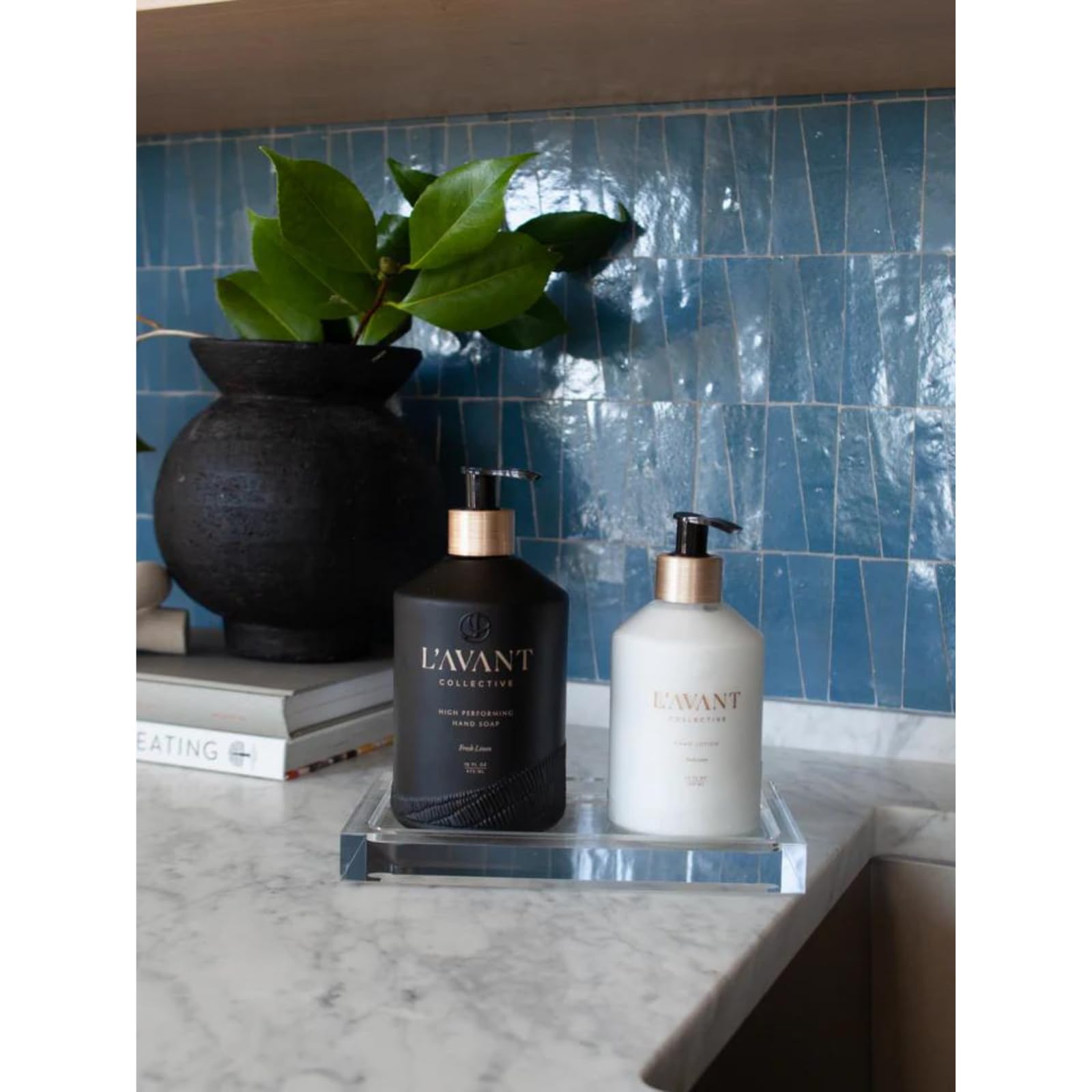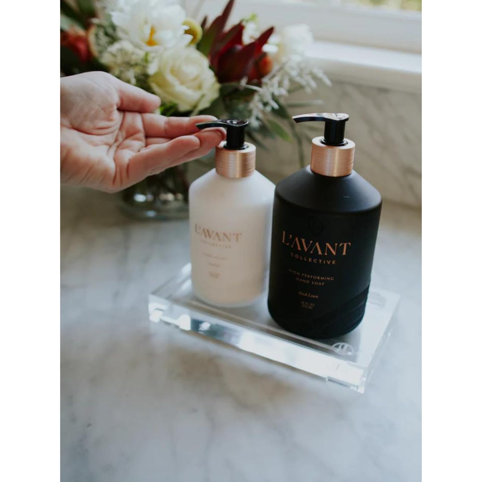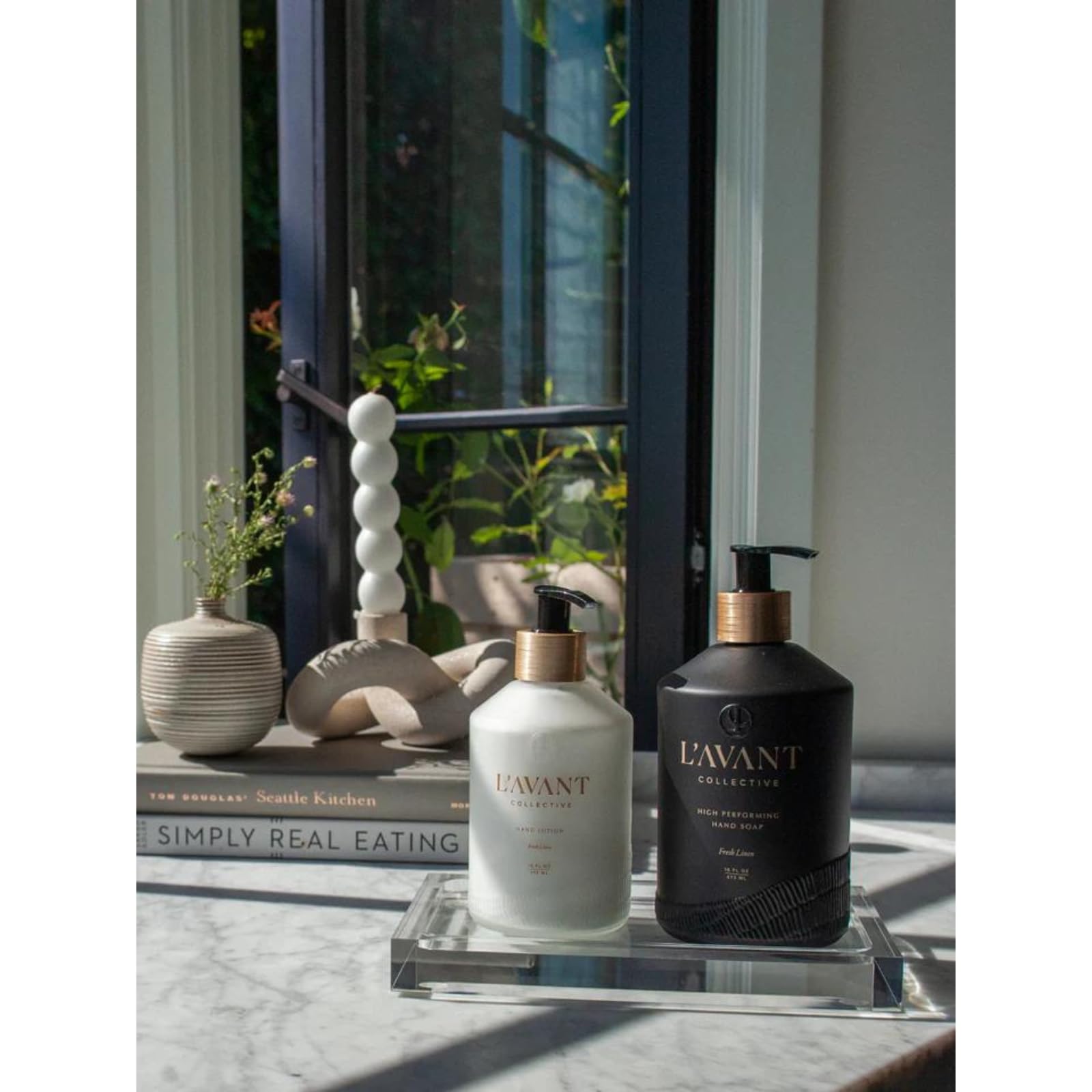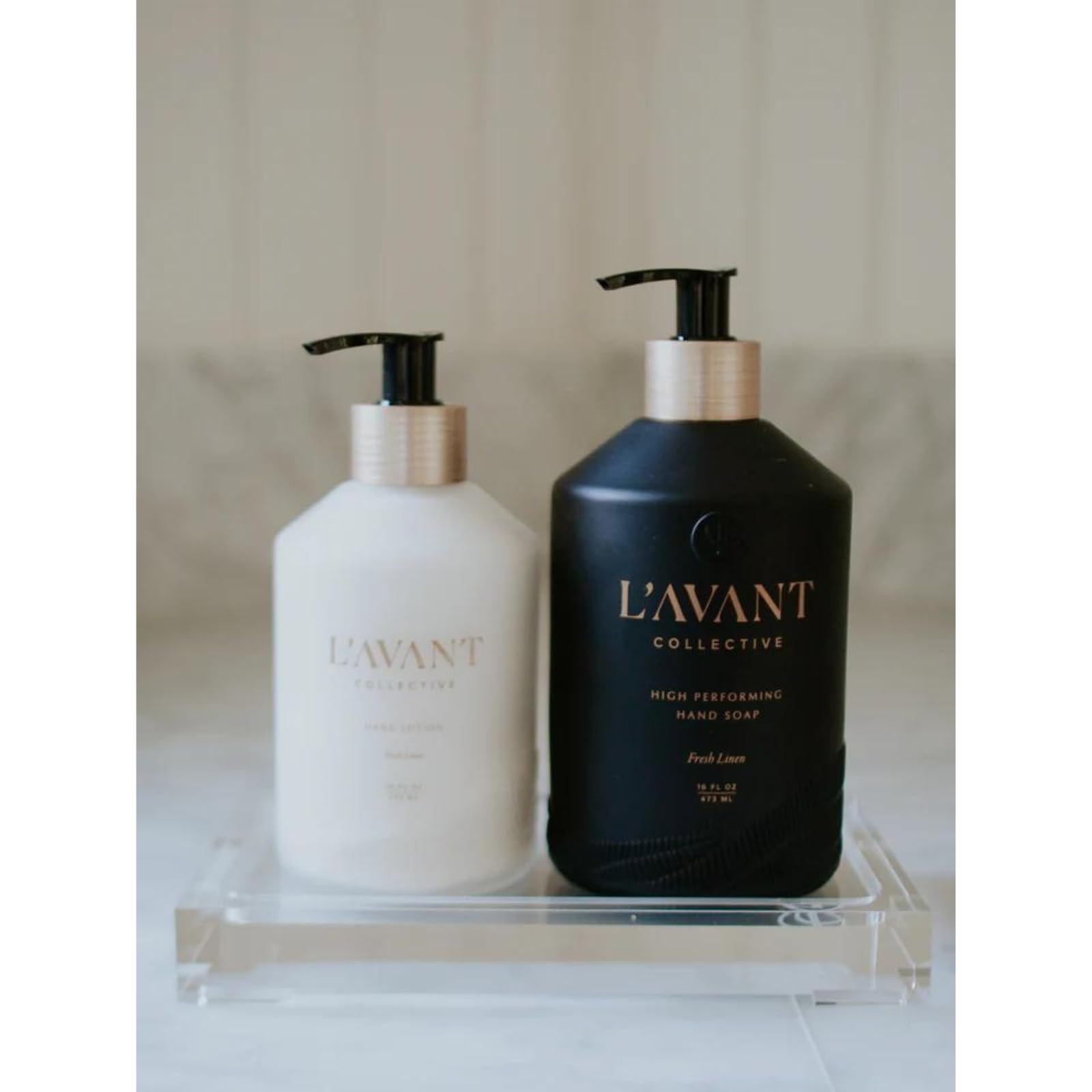 Luxurious Hand Lotion 10oz: The L'avant Collective Luxury Hand Lotion deeply nourishes and moisturizes dry, cracked hands, nails, and cuticles. Enriched with hydrating shea butter and our signature Fresh Linen fragrance, this non-greasy lotion restores your skin’s natural softness and smoothness. Perfect for daily use, it leaves your hands feeling supple and rejuvenated, even in harsh weather conditions, making it an essential in your skincare routine.