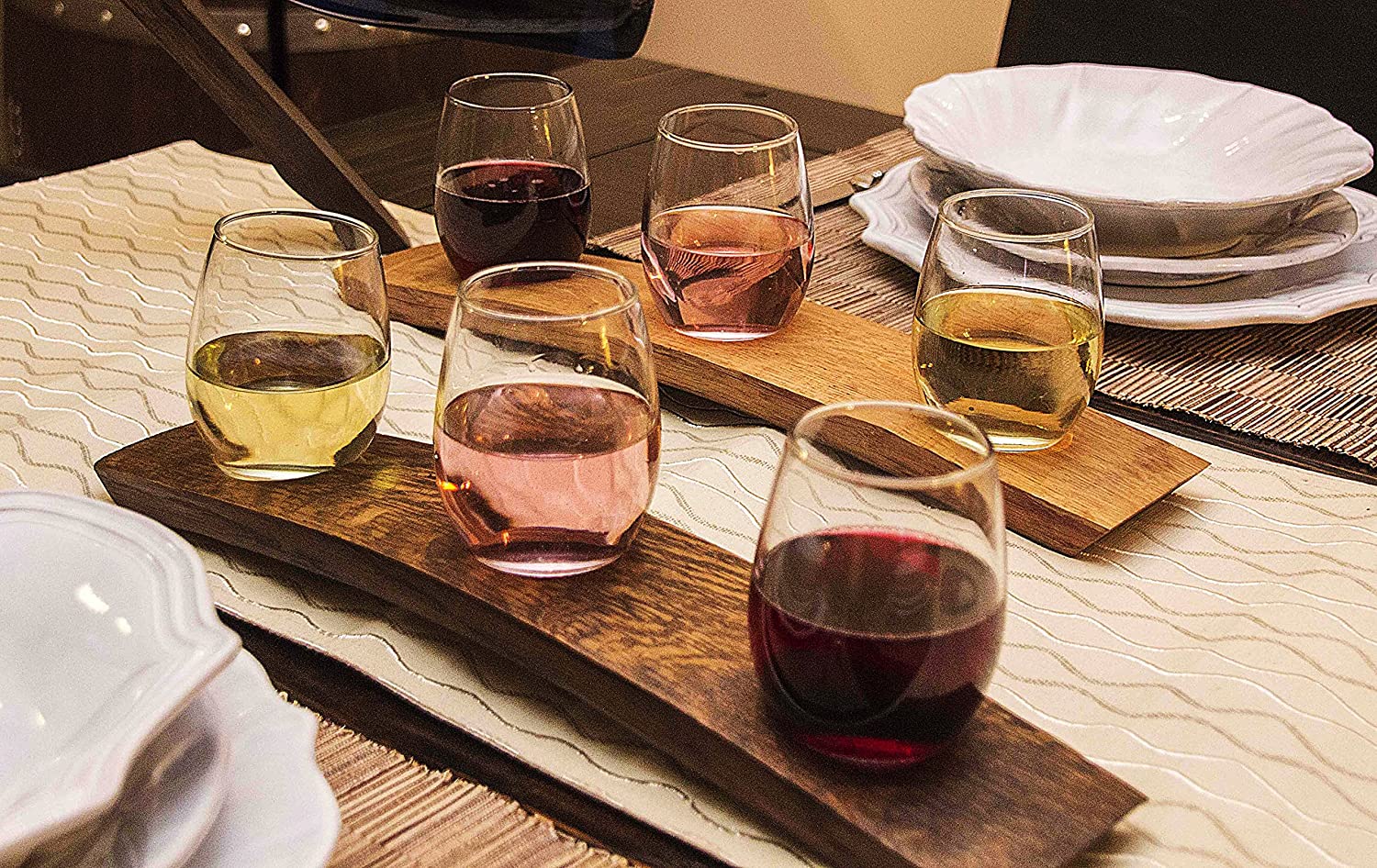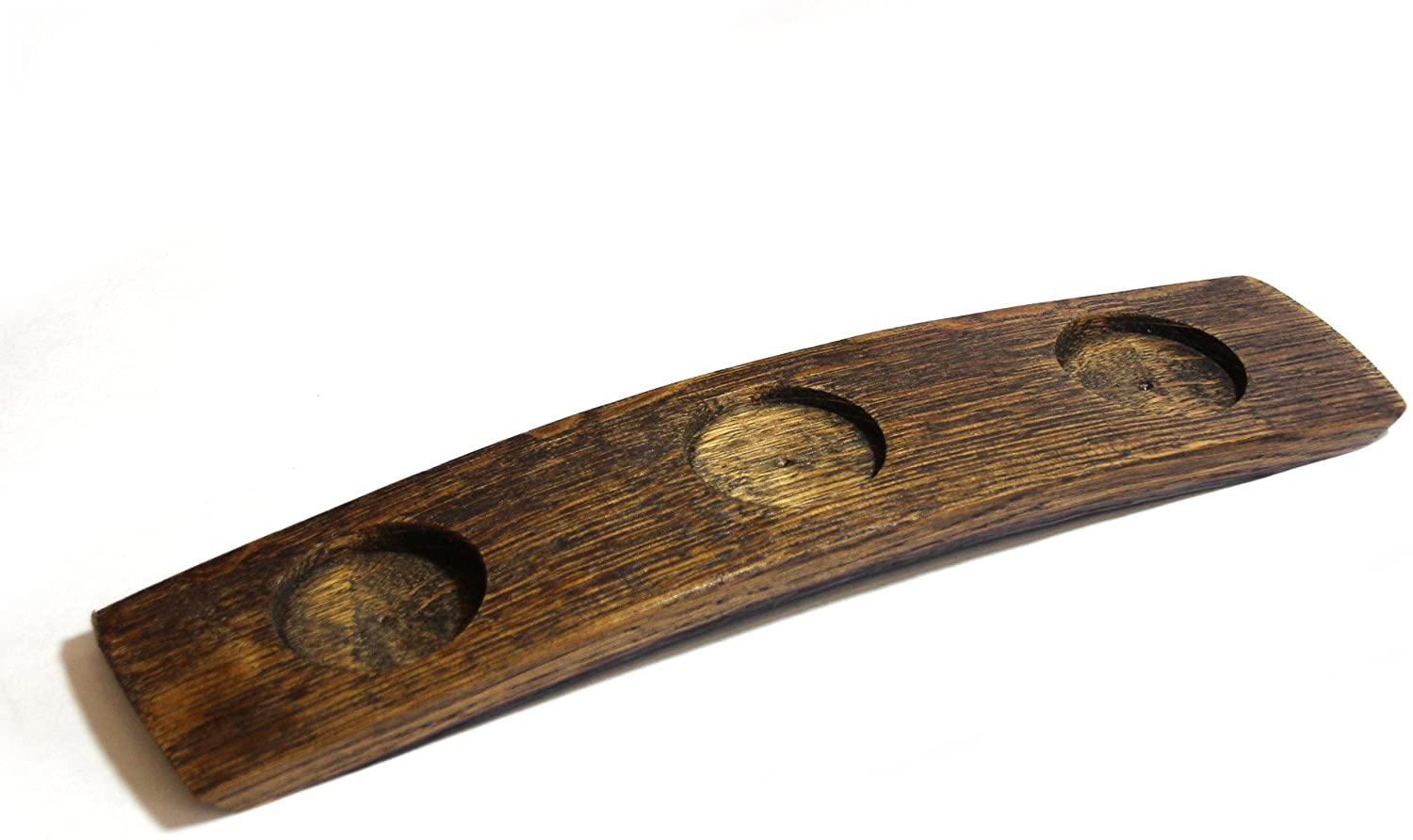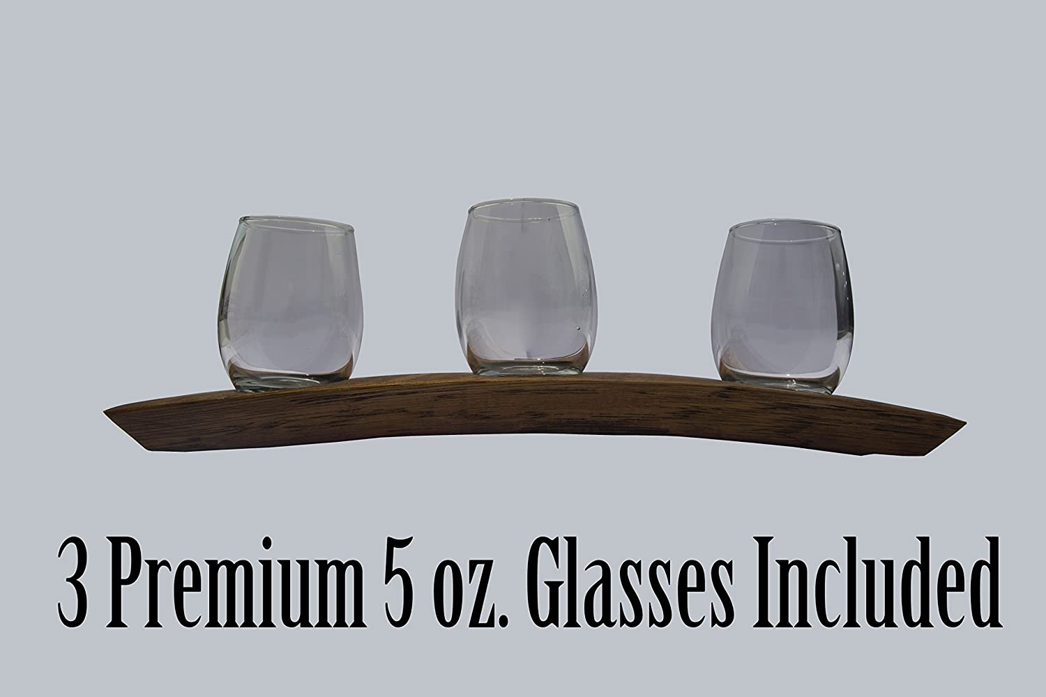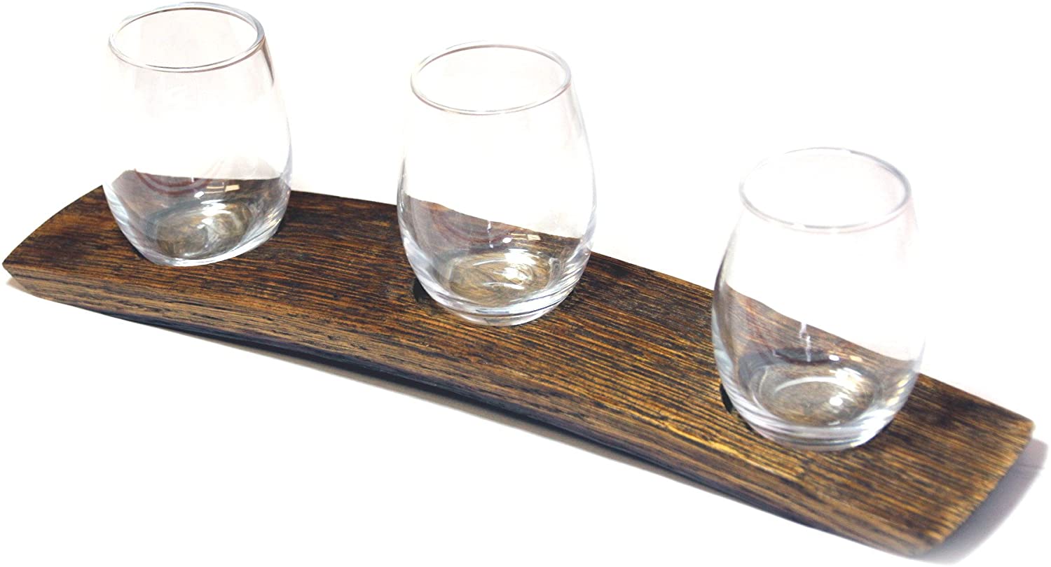 A perfect accessory for those who enjoy sampling their favorite wines in a unique and creative way. Each handcrafted wine flight has three 5.5 oz. stemless wine glasses on a French oak wine barrel stave. The bottom of the stave showcases the burgundy stain of the Bordeaux or Tempranillo wines that matured in the barrels. Appx 17” x 4”. Available in natural, red mahogany or dark walnut.
