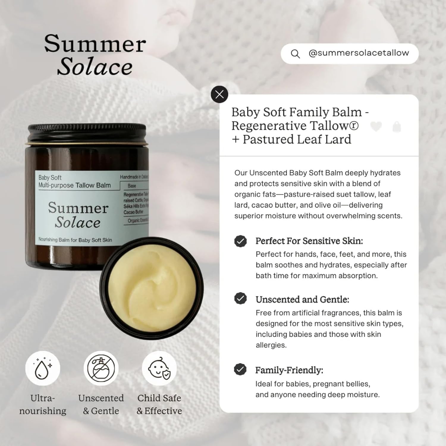 - Deeply Moisturizing & Velvety Soft – This rich, creamy balm blends tallow, leaf lard, cacao butter, and olive oil to provide lasting hydration. The smooth texture absorbs effortlessly, leaving skin feeling soft and supple without a greasy residue. Perfect for keeping delicate skin nourished and comfortable throughout the day.