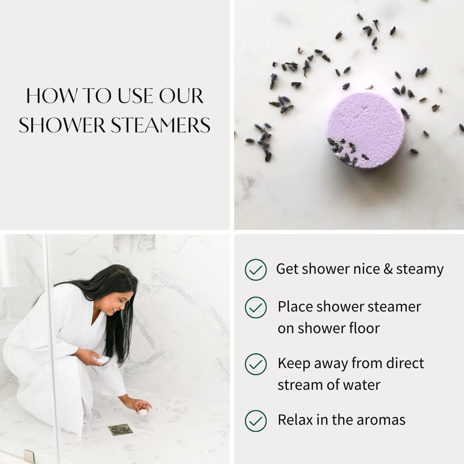 - USAGE TIPS: Simply place this shower steamers for women in the corner of the shower, or shower ledge where small amounts of water can touch the steamer. Wait for the relaxing fragrance to fill the atmosphere. Keep out of direct stream to ensure tablet lasts longer. Each shower steamer tablet lasts approximately 2 showers. High concentration of essential oils are contained in this product and is not recommended for skin use. For shower use only.