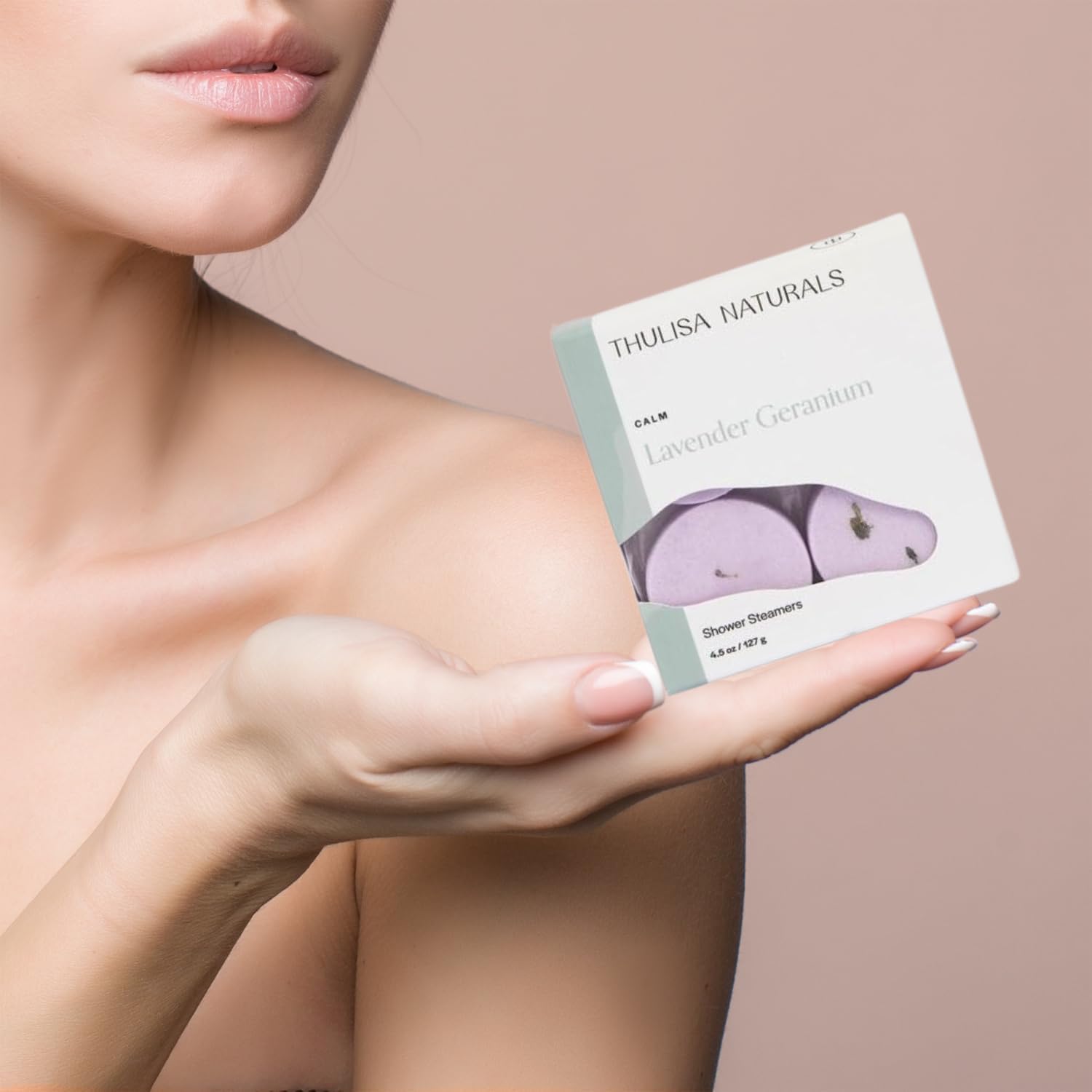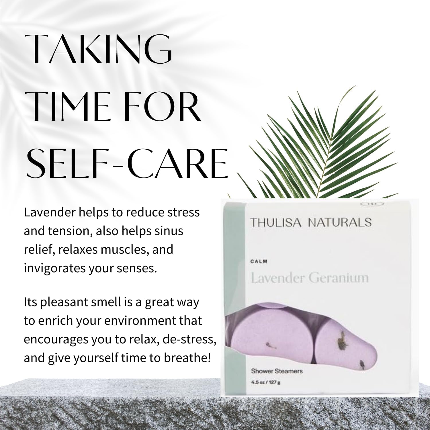 - RESTORE YOUR BODY & MIND: Our lavender shower steamer is infused with calming sweet and floral scents of Lavender and Geranium essential oils to give a soothing effect every time you are in the shower. Lavender helps to reduce stress and invigorates your senses. Its pleasant smell is a great way to enrich your environment that encourages you to relax, de-stress, and give yourself time to breathe!