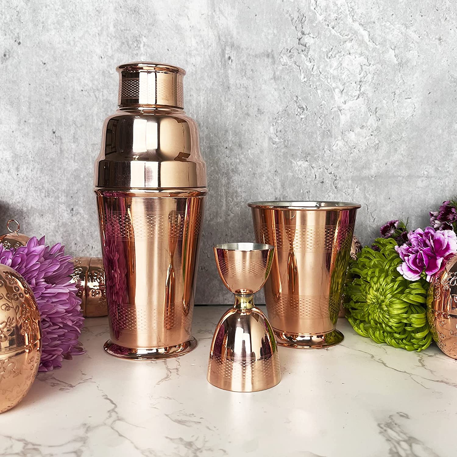 • Coppermill Kitchen has designed a matching heavy guage copper jigger with the matching engine turned design on each side and a brass accent in the middle.