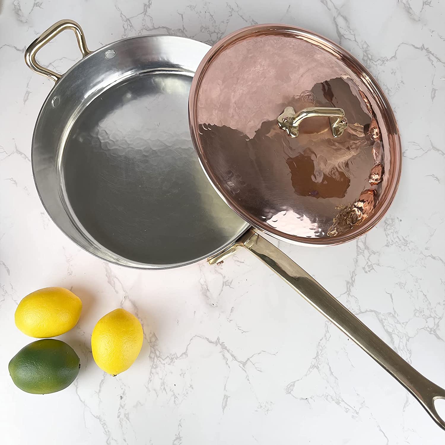 Coppermill Kitchen | Vintage Inspired Large Saute Pan & Lid | Authentic Copper & Brass | Tin-Lined | Hammered Finish | Made in Italy | 3.75 Quarts