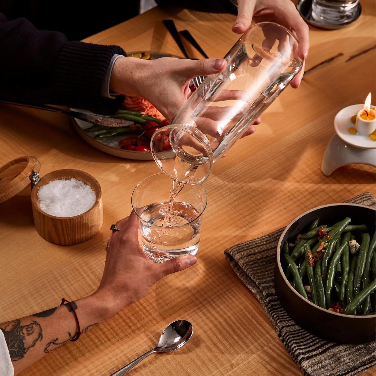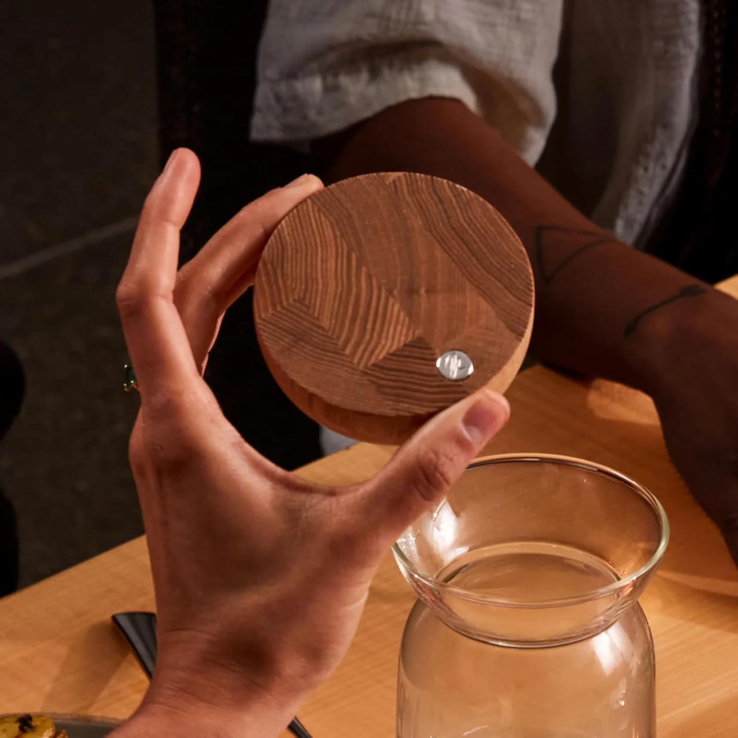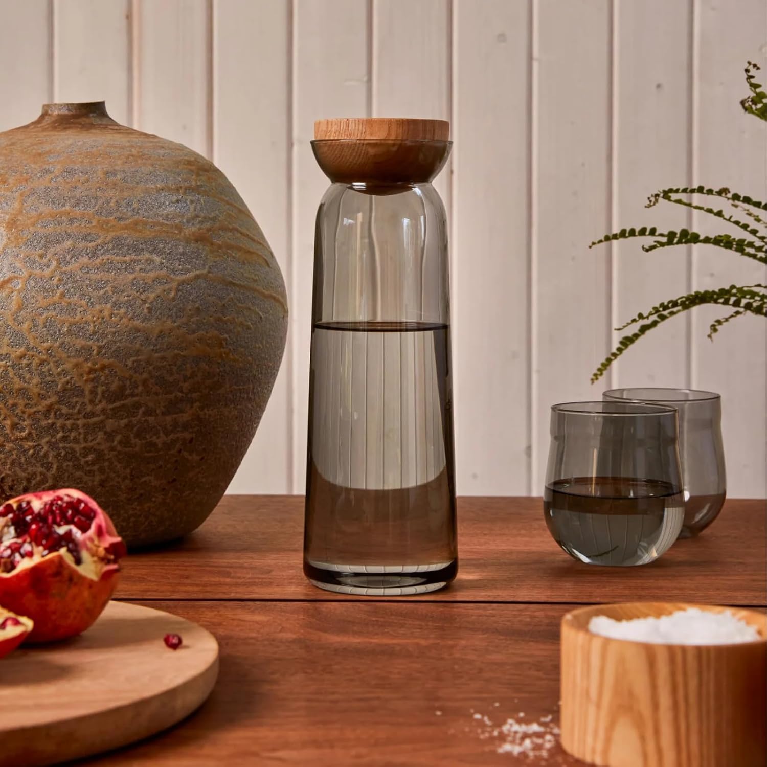 - Ash Wood Top Adds Natural Warmth and Function: The softly shaped ash wood top protects beverages between pours while adding a tactile, natural accent to the clear glass form. It brings a warm contrast to modern tablescapes or bar setups.
