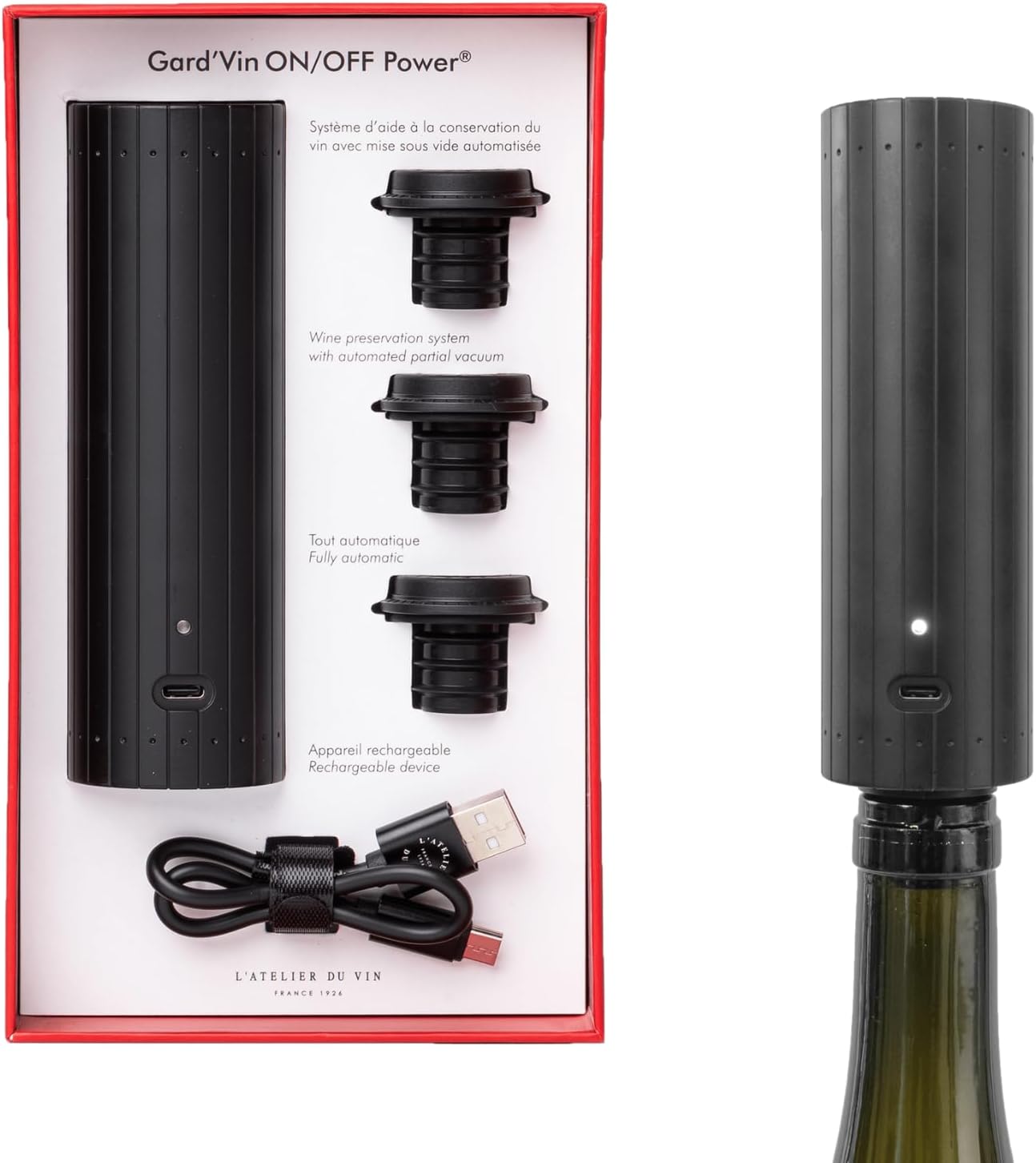 - Nothing gets lost: L'Atelier du Vin ensures everything with the Gard'Vin On/Off Power and the three Gard'Vin stoppers that accompany it. They will allow you to re-seal your bottles and preserve their fragrances