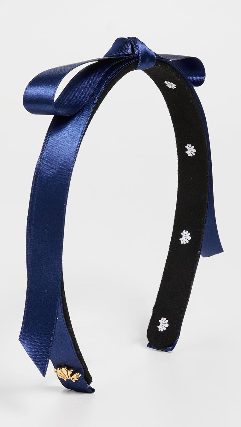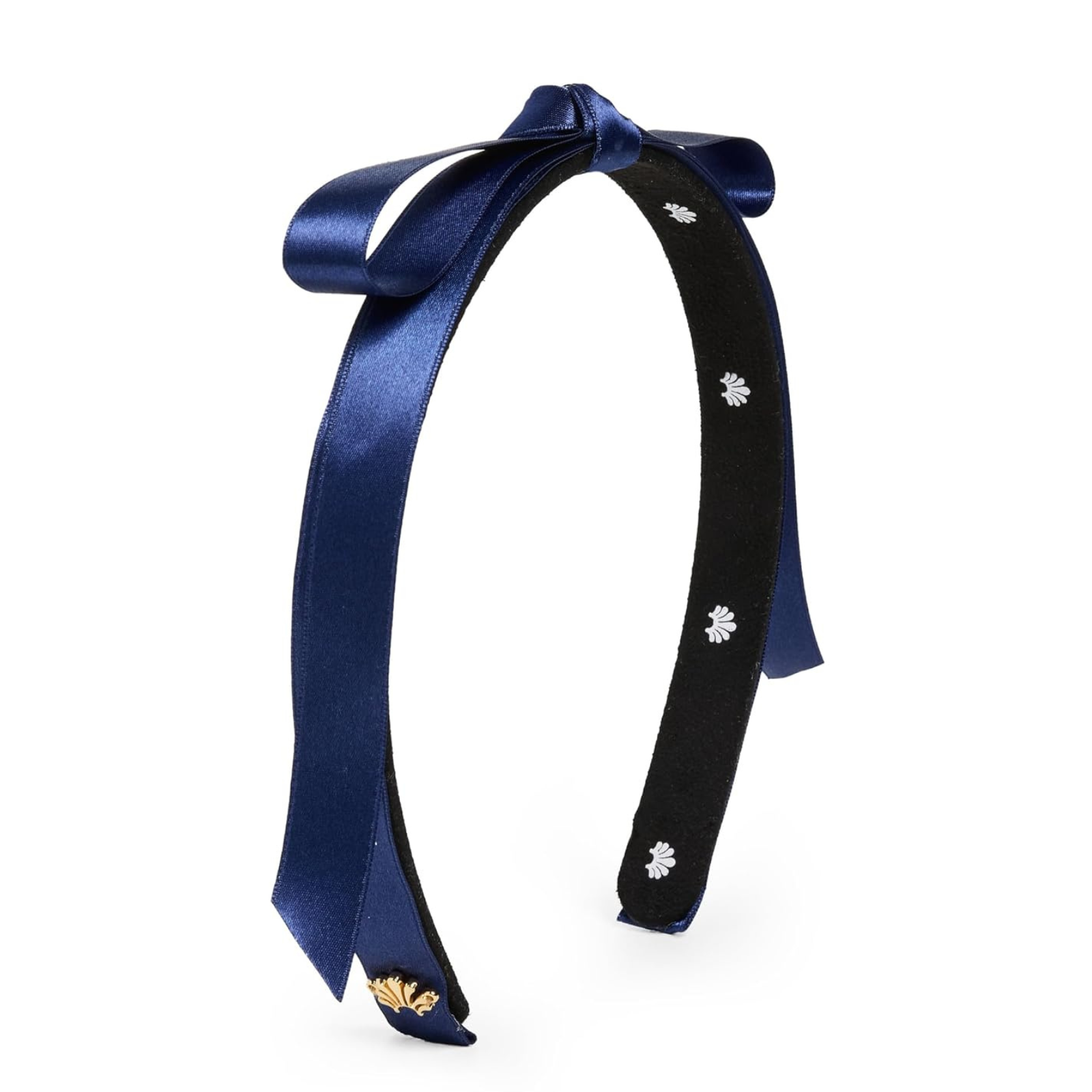 Inspired by 1960s French style, the Bardot Headband features a slim silhouette with a hand‑knotted bow for timeless elegance. Crafted from navy satin ribbon, it’s designed with a 1/2" comfort fit width band for all‑day wear and finished with the trademark logo charm.