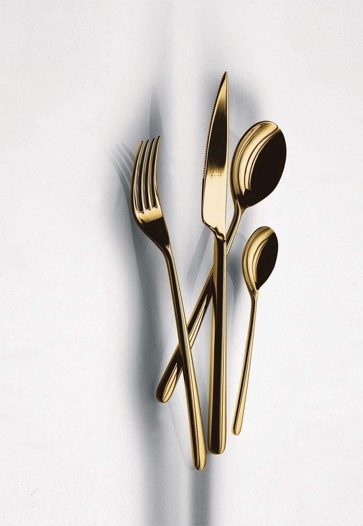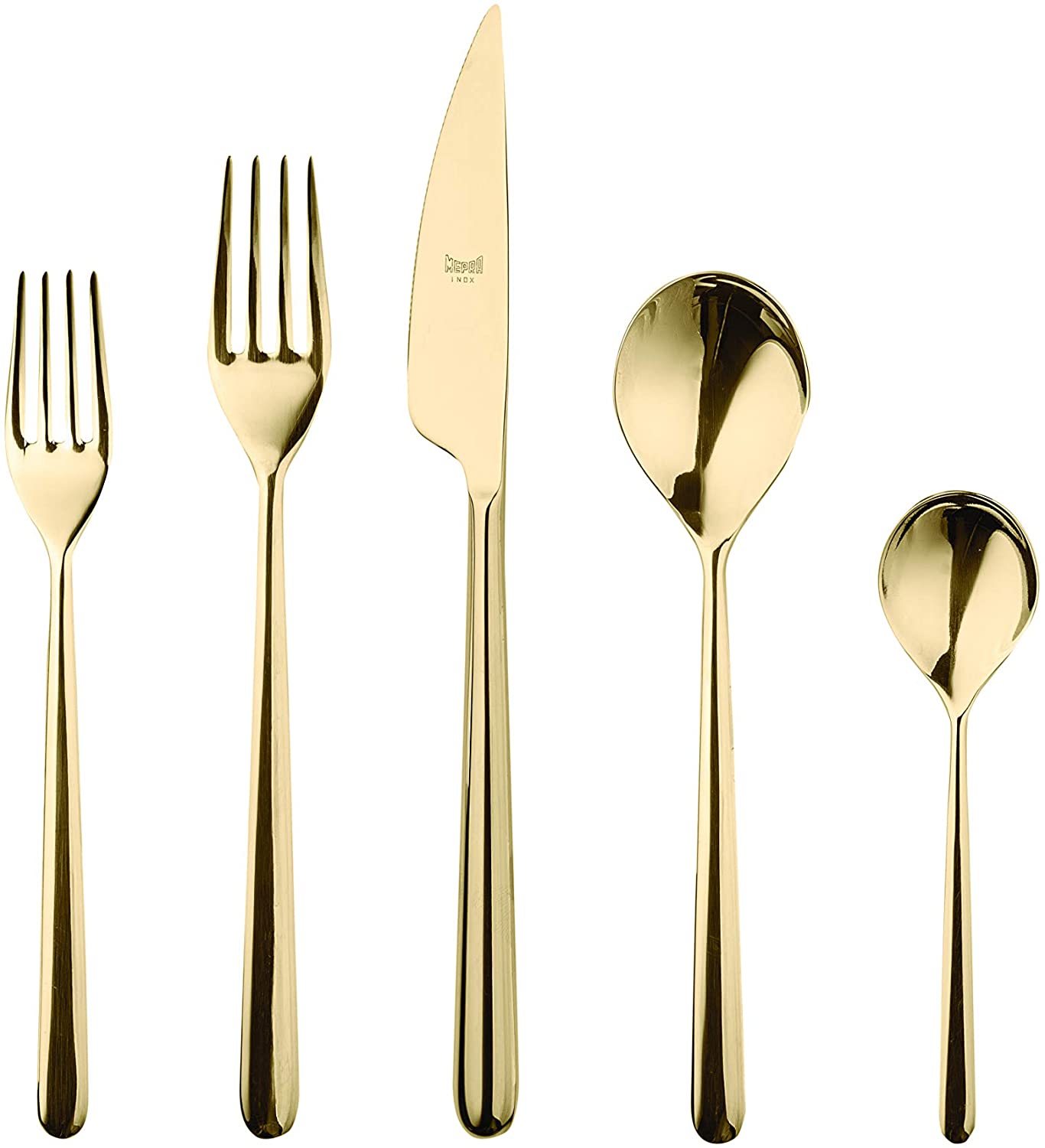 - 5 PIECE CUTLERY SET INCLUDES: Available in a polished gold finish, this Mepra 5-piece set includes 1x table fork, 1x table knife, 1x dessert spoon, 1x dessert fork, 1x USA coffee spoon. This is a complete flatware set for 1 table setting.