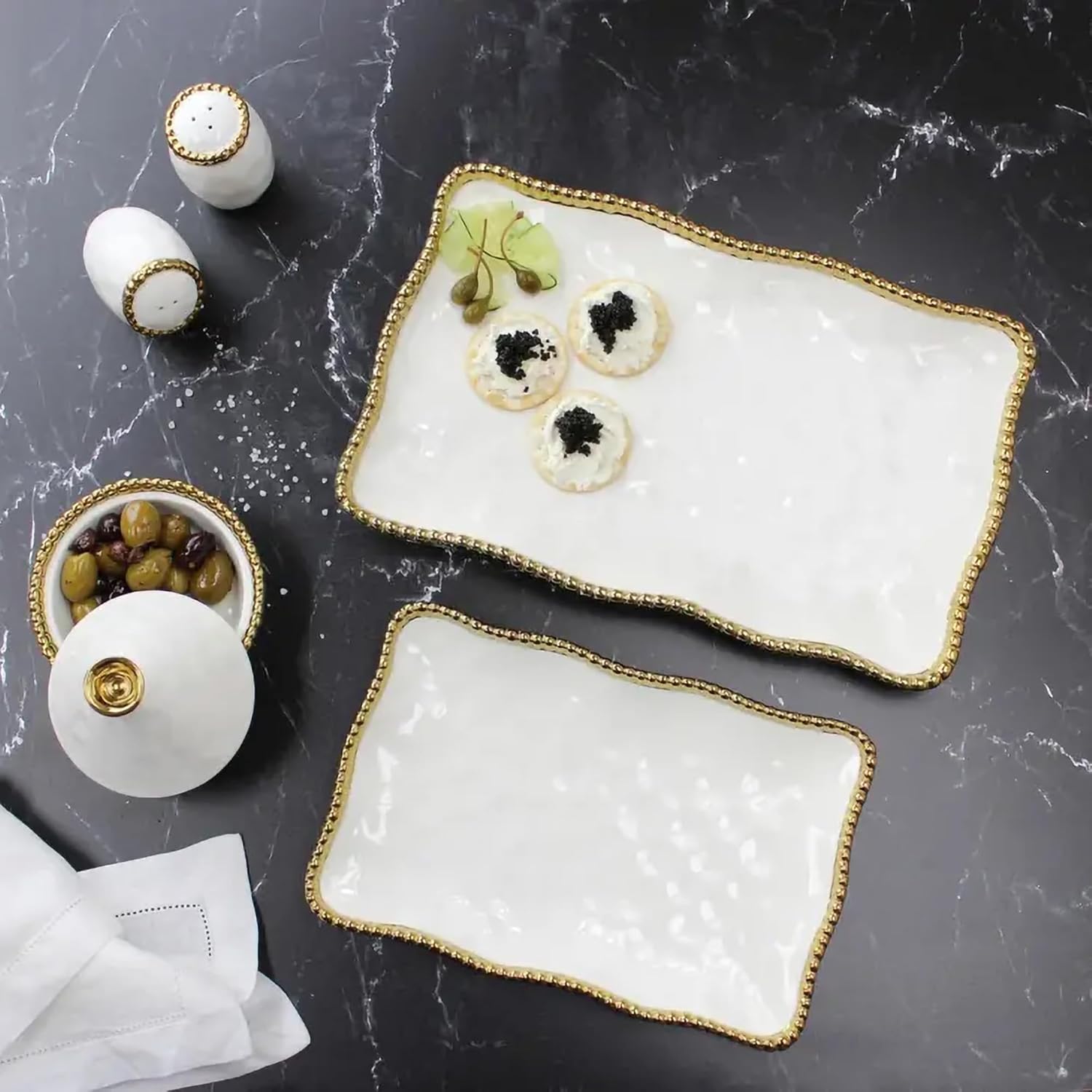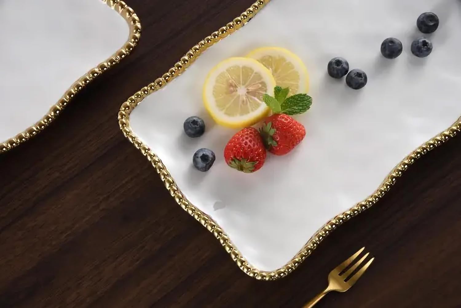 - High-fired white porcelain finished in gold tone titanium beaded rim