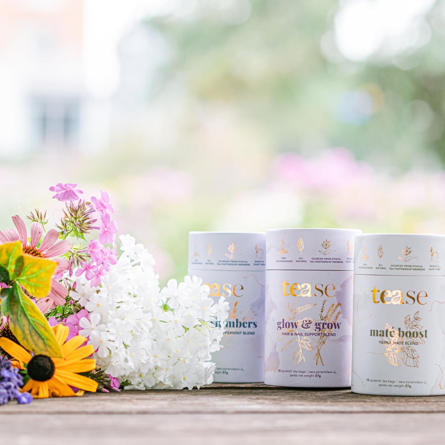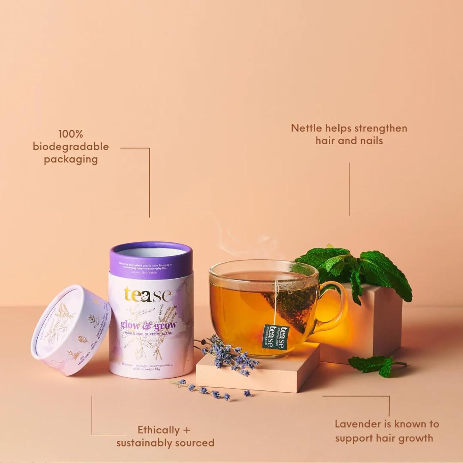 Tease Tea Organic Tea Gift Set | 15 Piece Botanical Pyramid Tea Bag Infuser Sachets Loose Leaf Hair & Nail Support Blend with Nettle, Rooibos, Spearmint, Lavender Caffeine Free 37g (Glow & Grow)