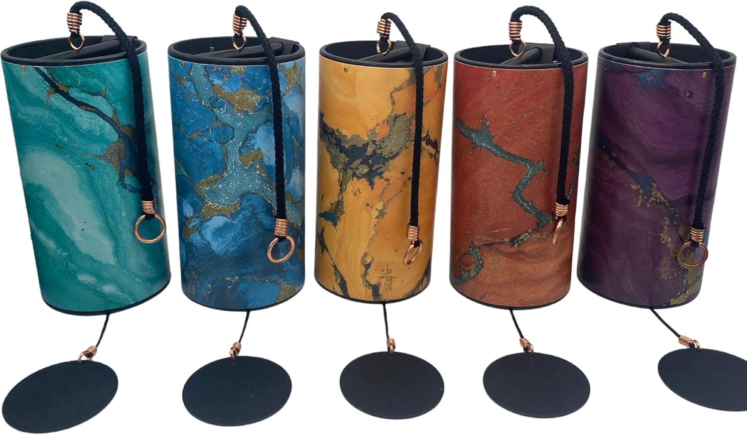 - The chimes are made of bronze and soldered to the base plate with silver. The pendulum/striker is made of glass. The body, made of high-quality cardboard, is covered with a robust, decorative paper with an oil-painted marble effect and waxed.